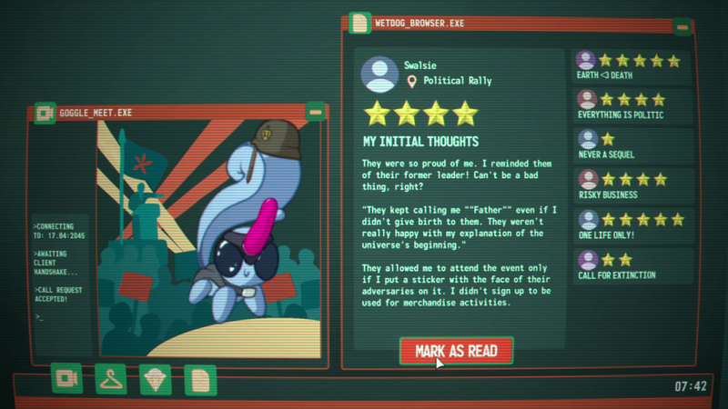 Suit Advisor is an intergalactic organization that provides disguises to aliens who desire to attend specific Earth's Events.